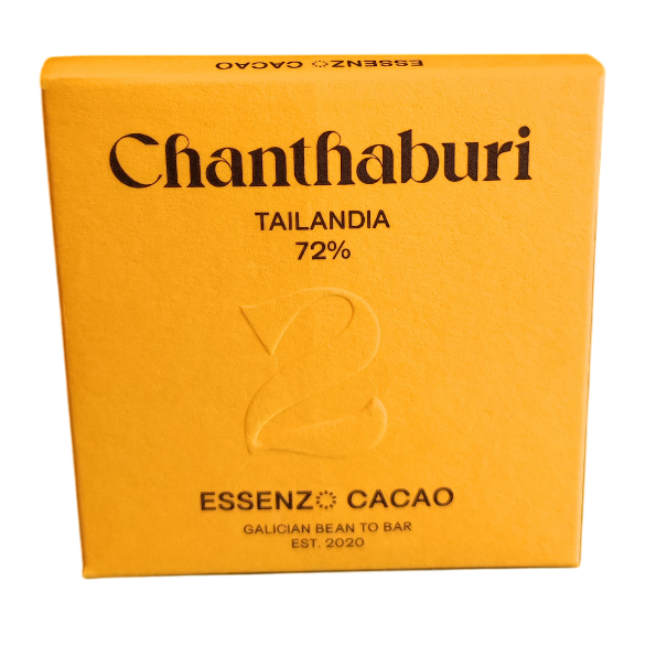 Chocolate negro de origen único Tailandia con 72% de cacao de la provincia de Chanthaburi. Elaborado artesanalmente por Essenzo Cacao, bean to bar gallego con tradición desde 2020.