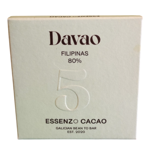 Chocolate negro intenso de origen único Filipinas con 80% de cacao de la región de Davao. Elaborado artesanalmente por Essenzo Cacao, bean to bar gallego con tradición desde 2020. Sabores únicos del archipiélago asiático.
