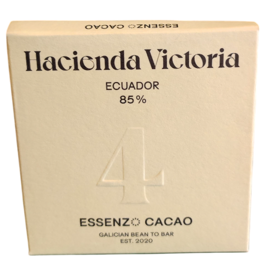 Chocolate negro ultra intenso de origen único Ecuador con 85% de cacao de la Hacienda Victoria. Elaborado artesanalmente por Essenzo Cacao, bean to bar gallego con tradición desde 2020. Chocolate para verdaderos puristas.