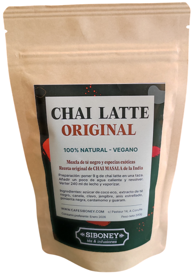 Mezcla tradicional de té negro y especias exóticas. Receta original de Chai Masala de la India. 100% natural y vegano.